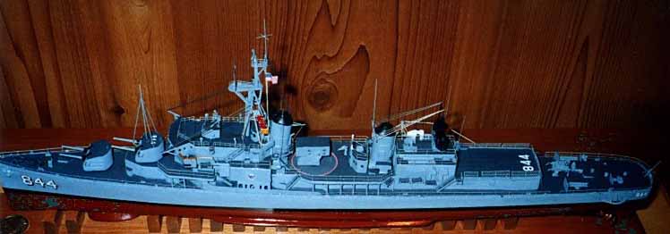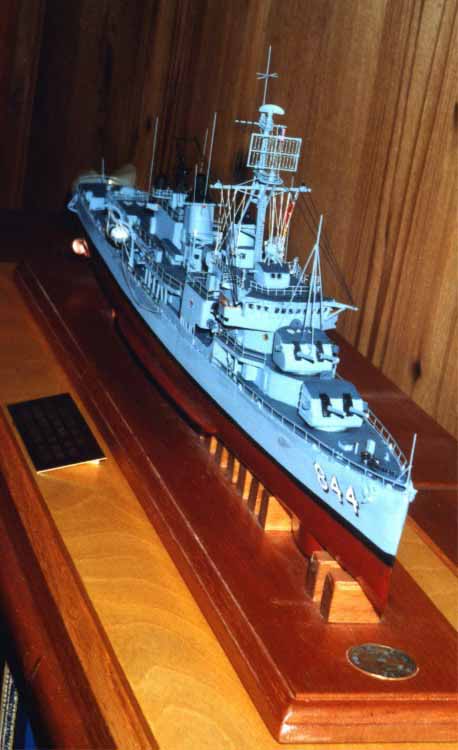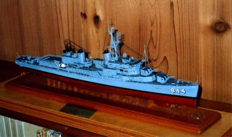 USS Perry DD844 1968-69 Virginia Beach, VA PJWatson@worldnet.att.net I wanted a model of the PERRY soon after leaving the ship. At that time I figured that that was the best tour of duty I would ever have and after 30 years of Naval duty that proved to be true. When I was in Washington I got a copy of the Booklet of General Plans of the ship as she was in 1969. I found a model kit of the GEARING and used what I could from that. Unfortunately, other than the hull not much could be used. I had to FRAM the model. Everything would have to be bought or made separately. I didnt start working on the ship until in the 1990s and then it was an off again on again project. I am a docent at the Hampton Roads Naval Museum and they were looking for someone to build models at the museum for the visitors going through. Progress is slow as you are always talking to people coming through while trying to make progress on the model. After I built a model of the GAMBIA BAY for the Museum I brought my PERRY model in and worked on it there and got it 90 percent complete. Then there was a hobby exhibit at our church and I got fired up to finally complete the model. It is 1/8 - 1 scale. I have no idea how many hours I put in. Using the Booklet of General Plans the model is as close as possible to what the ship was like in 1968/9. The only major error is I had to use 3 bladed props vice 4 since I havent been able to find what I want. Some day Ill find a set of 4 bladed props that are the right size or maybe Ill make them. Regarding other models, I have a large model of the CHARLES W. MORGAN and am working on a model of DILLIGENCE. |